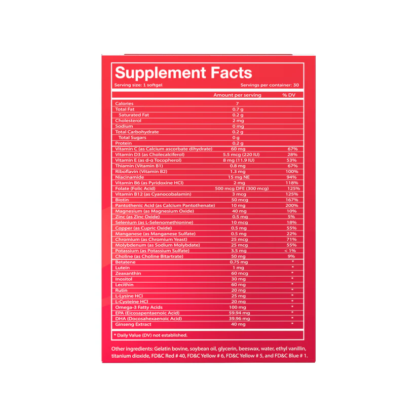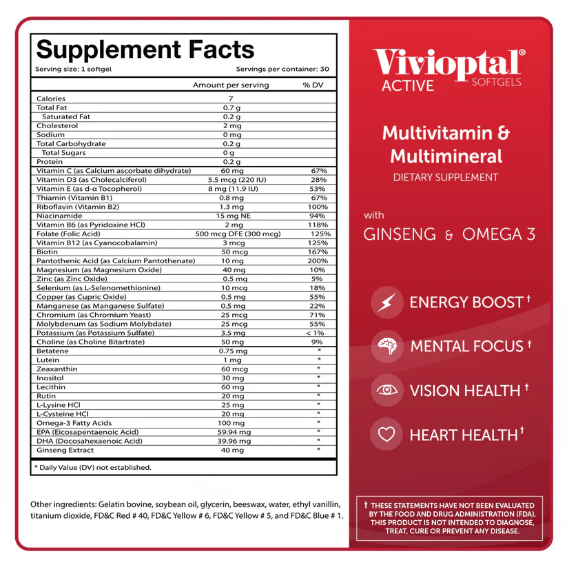 Made in the USA with a German‑inspired formulation, Vivioptal® Active provides targeted support for heart health, immunity, and cognitive function. Its combination of B‑complex vitamins, Ginseng extract, and Omega‑3 (EPA & DHA) helps enhance stamina, improve concentration, and promote overall wellness.