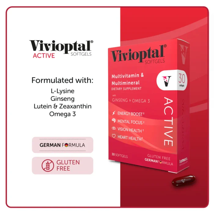 Vivioptal® Active is a premium multivitamin and multimineral formula enriched with Ginseng and Omega‑3 fatty acids to support energy, focus, and daily performance. Designed to counter the effects of stress and nutrient depletion, it delivers a powerful blend of vitamins, minerals, antioxidants, and essential fatty acids that help maintain physical and mental vitality.