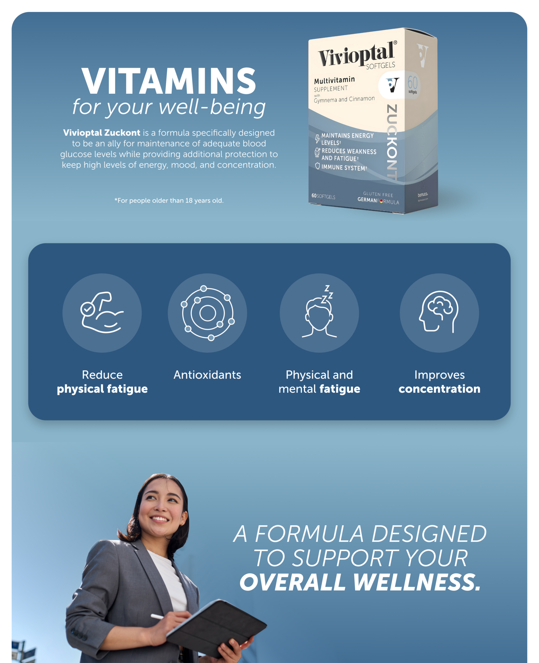 Vivioptal® Zuckont is a specialized multivitamin and mineral formula designed to support individuals dealing with high blood sugar, prediabetes, or diabetes‑related metabolic concerns. Its advanced blend of Gymnema, Cinnamon, Turmeric, Zinc, and essential vitamins helps regulate glucose levels, improve insulin response, and support cholesterol balance.